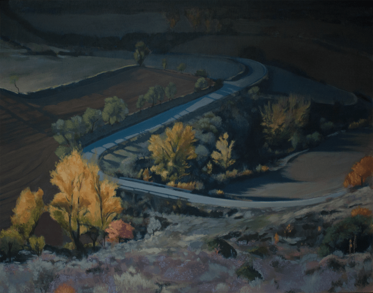 Atardecer en el puente del Cañarquero · 2017 73x92 cm Acrílicos sobre tablero · Acrylics on board · Los ritmos de la naturaleza se acompasan al atardecer. The rhythms of nature they blend in at sunset.