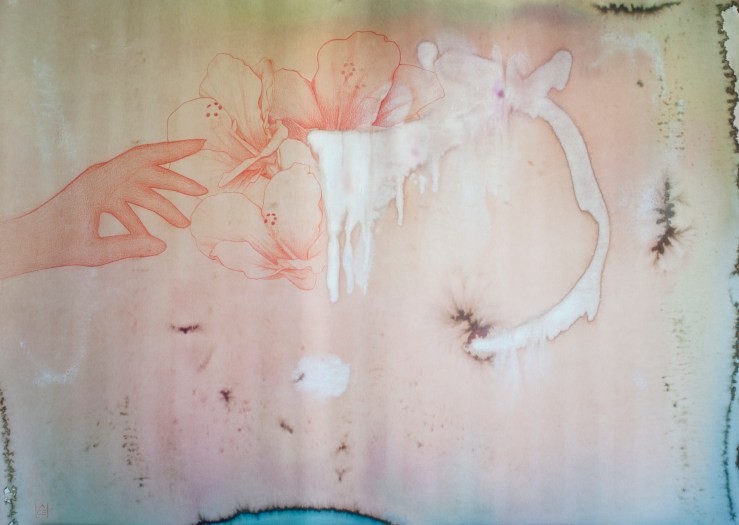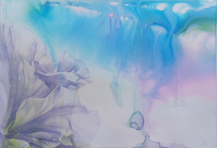 Sensitivo nr.1 · 2017 50x70 cm Acuarela y lápices sobre papel Basik Guarro 300 g/m2 · Watercolors and pencils on paper · La aparición de una forma de color se genera tan orgánicamente como el crecimiento de una flor. The appearance of a color form it is generated so organically like the growth of a flower.
