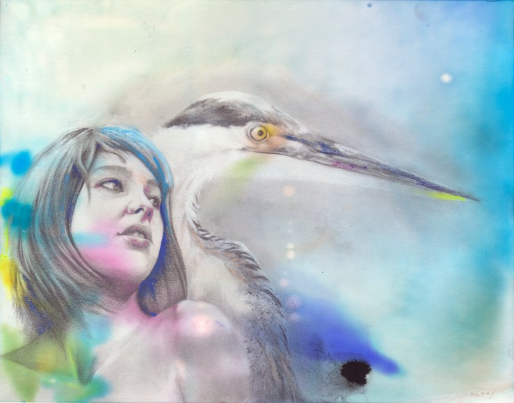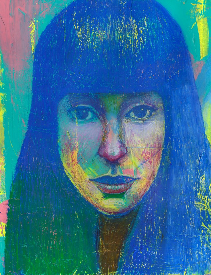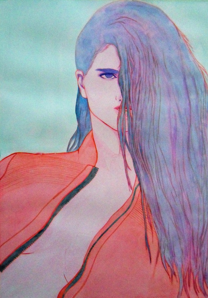 Woman in Blue · 2017 45x35 cm Acrílicos y pasteles al óleo sobre papel Basik Guarro 300 g/m2 · Acrylics and oil pastels on paper