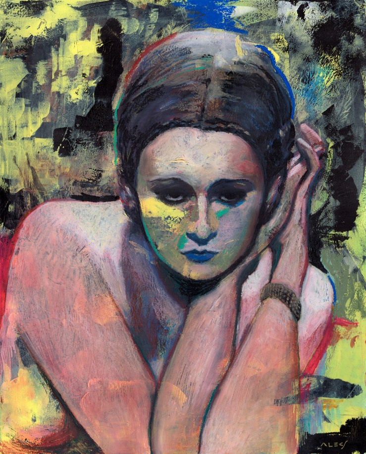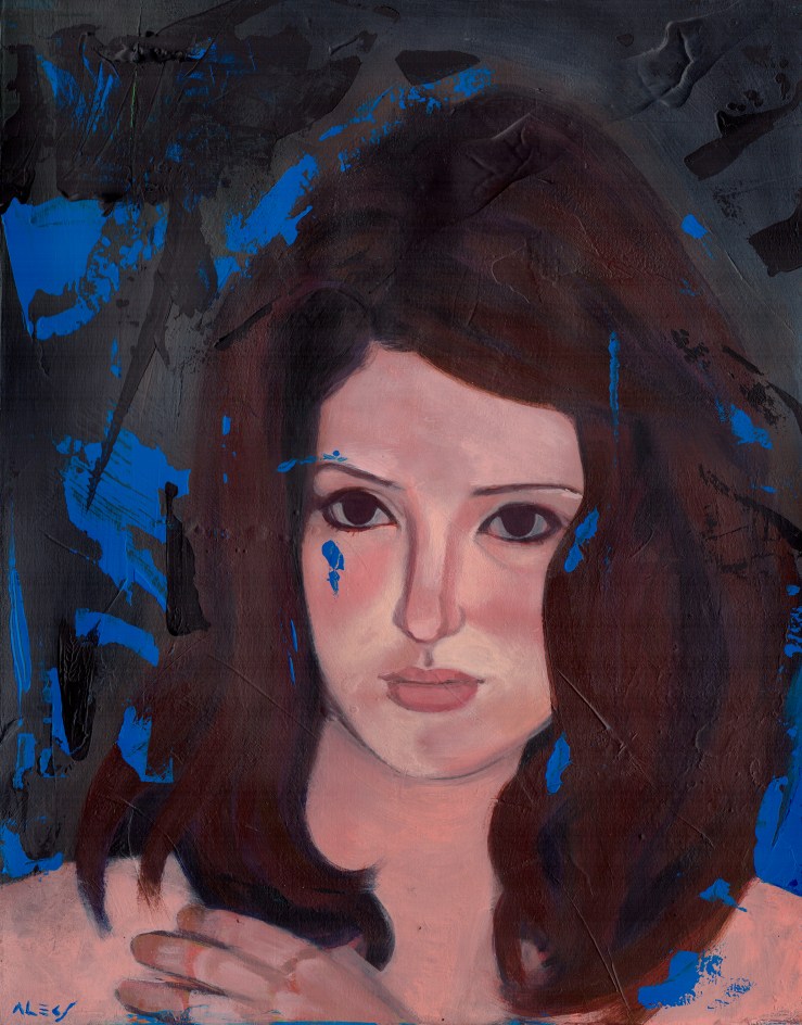 Blue Lips · 2019 50x40 cm Acrílicos y pasteles al óleo sobre papel Basik Guarro 300 g/m2 · Acrylics and oil pastels on paper · Nostalgia de tiempos no vividos, de maneras más poéticas. Nostalgia for times not lived, in more poetic ways.